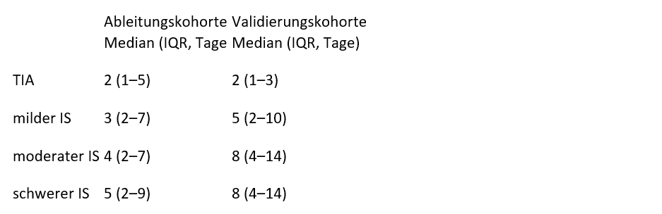 In der Ableitungskohorte wurde die Therapie mit DOACs im Median 4 Tage nach dem initialen IS beziehungsweise der initialen TIA eingeleitet. In der Validierungskohorte war dies im Median an Tag 6 nach dem initialen IS-/TIA-Ereignis der Fall. Auch nach einem schweren IS lag der mediane Therapiebeginn in beiden Kohorten deutlich vor den in der 1-3-6-12-Tage-Regel empfohlenen 12 Tagen (siehe Tabelle 1).3
